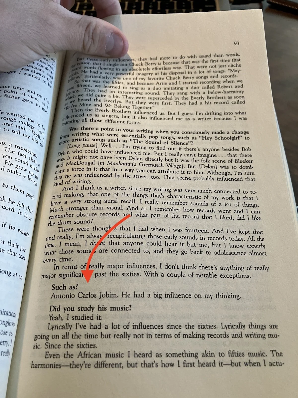 One of the more interesting discussions of musical influences comes from the interview with Paul Simon. This is one where it gets a little deep into technical songwriting techniques, and I was surprised to see Paul Simon reference such specific influences from Antonio Carlos Jobim and 12-tone music theory.
