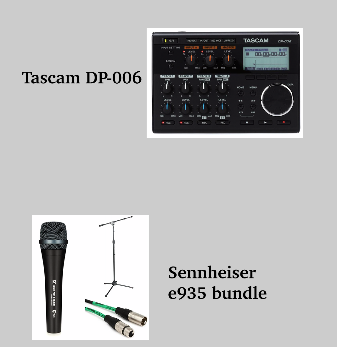 In this set of gear, we’ve got a small digital 6 or 8 track recorder, paired with a Sennheiser e935 microphone bundle that includes a mic stand and cable. Under $500 for everything at the time of this writing-quite affordable for many people!
